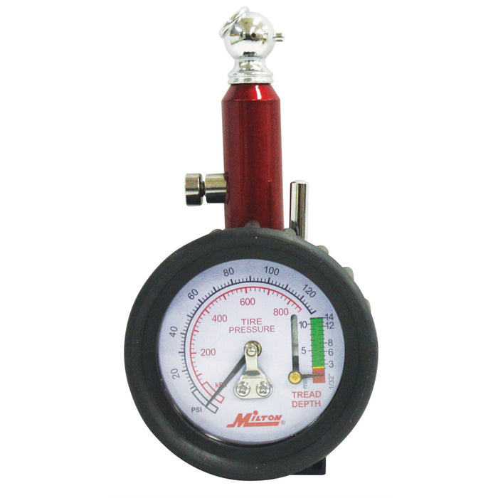 • Milton (S-934) Single Head Dial Gauge with Tread Depth Gauge Tire gauge with tire tread depth gauge offers a pressure range of 0-120 PSI. Dial type gauge with internal diaphragm construction for greater durability. Built in tire tread gage. 47 degree chuck head with deflator valve. Durable rubber boot for added durability. DRIVE SAFELY: Maintaining proper tire pressures improves vehicle handling, reduces risk of tire failure, improves fuel economy, and increases the life of your tires.
