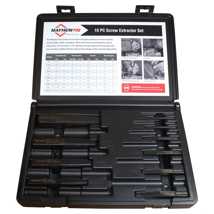 The Mayhew Pro master set of screw and pipe extractors includes: