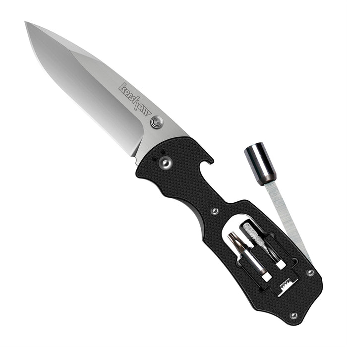 The Select Fire brings a new definition to a tool knife. A folding knife that includes a bit driver. Bits are stored in the handle. Bit holder can be opened to remove bits and retracts back into the handle. Holds standard 1/4" driver bits.The handle is made of glass-reinforced nylon.